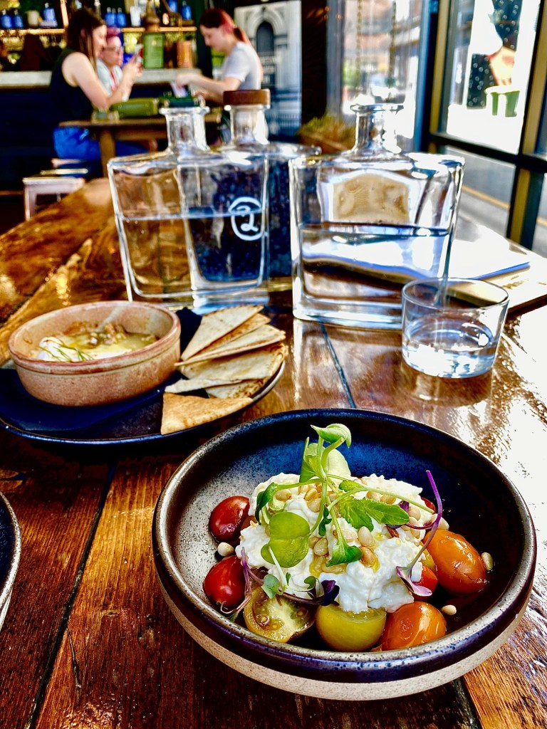 As it was my first visit, I went into the bar to ask the protocol, and one of very friendly young bar staff told me that they would quickly clear a table so we could sit inside. The day was warm, and I was glad of the air conditioning. We were given menus and quickly decided to share the Baked Brie with walnut rosemary and honeycomb, and the Stracciatella tomato salad. My friend who was still bemoaning her lack of coffee, was mollified when she found a non-alcoholic espresso martini. I, on the other hand, had come especially for the gin so I opted for the New World Flight, which consisted of the Prohibition Moonlight, Blood Orange 2021 Vintage, and the latest aforementioned Juniperous Gin, with chosen garnishes.